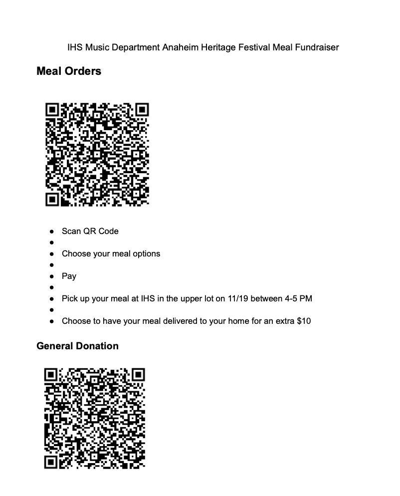 All meals are donated and 100% of proceeds support the Music Department’s trip to the Anaheim Heritage Festival!